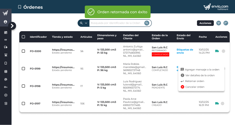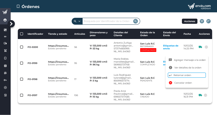Genera una orden de devolución en Fulfillment