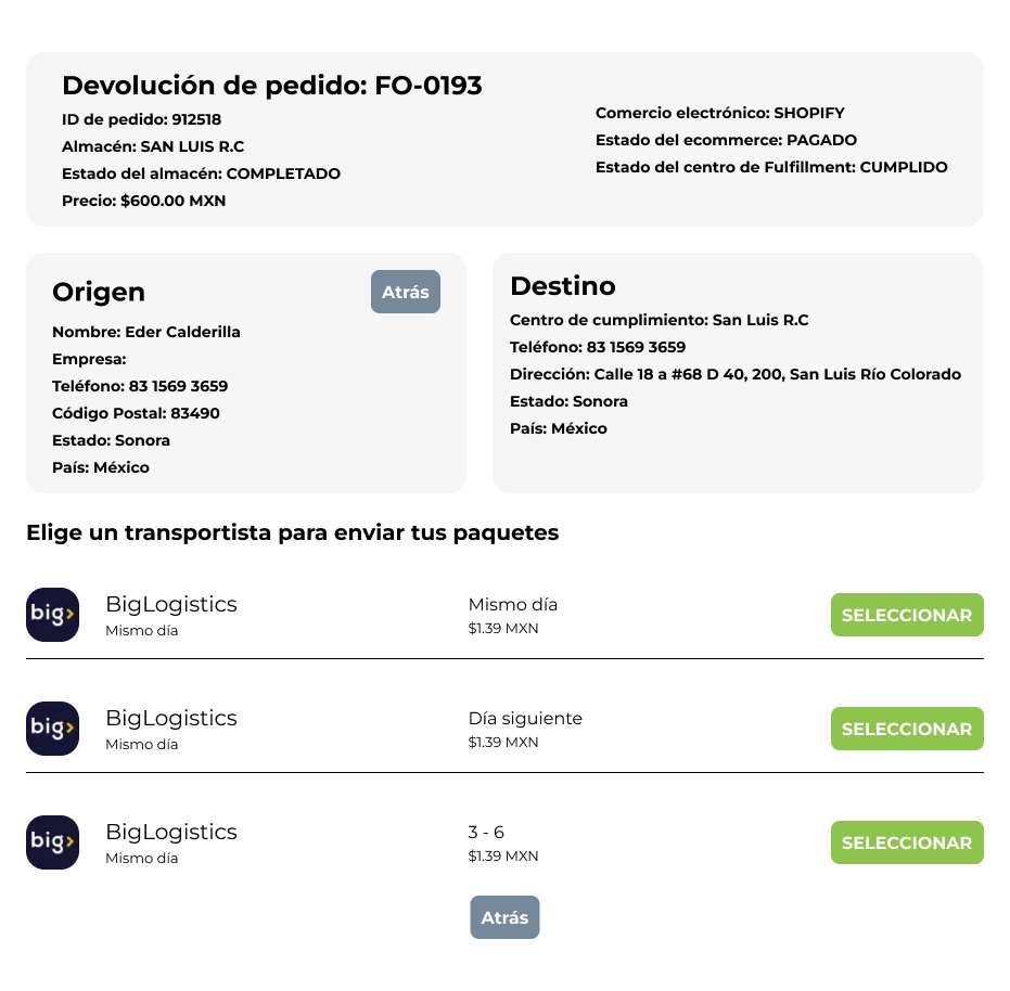 - Se genera una guía de retorno con la paquetería disponible en el sistema.