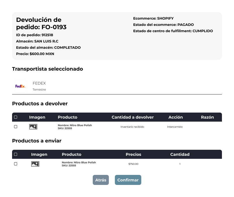 - Cambio: Se generará un nuevo envío con el producto sustituto.