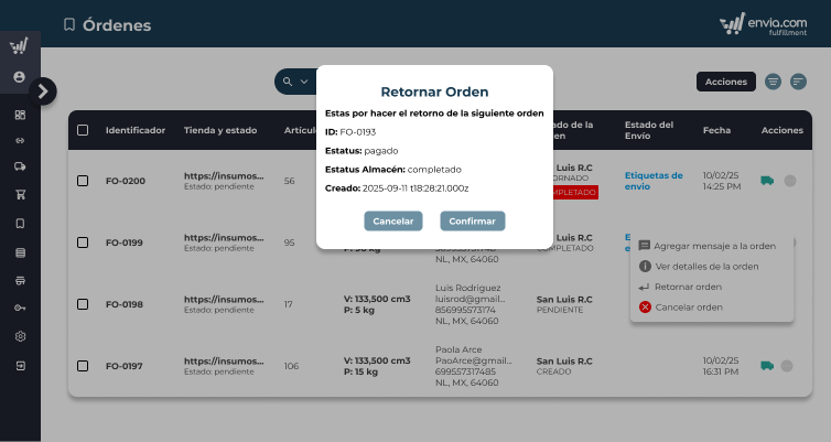 - 2. Al elegir Devolución de orden, se abrirá un modal para confirmar los datos de la orden.