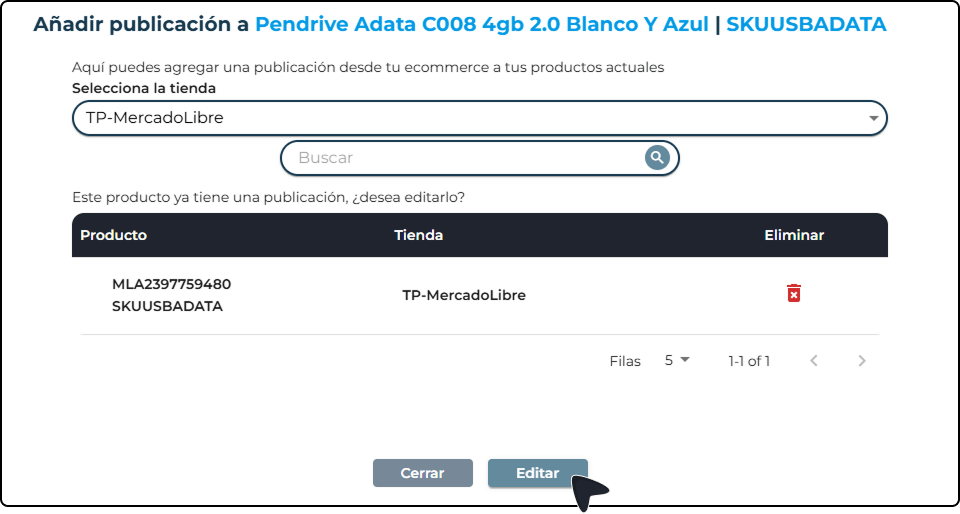 Nota: Si al seleccionar la tienda para añadir publicación se muestra una imagen como la siguiente, solo presionar Editar para habilitar los siguientes pasos.