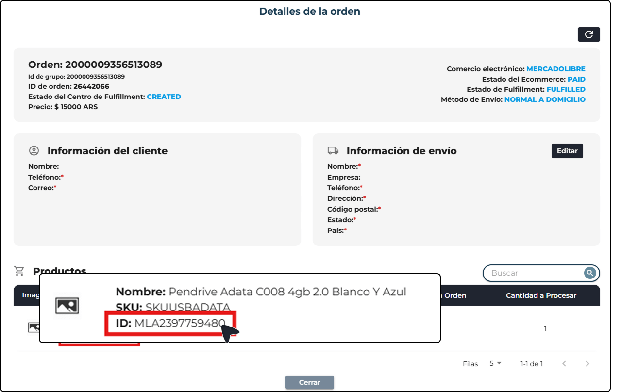 3. Al revisar los detalles de la orden, veremos que el producto a despachar es el mismo SKU pero su ID es diferente.